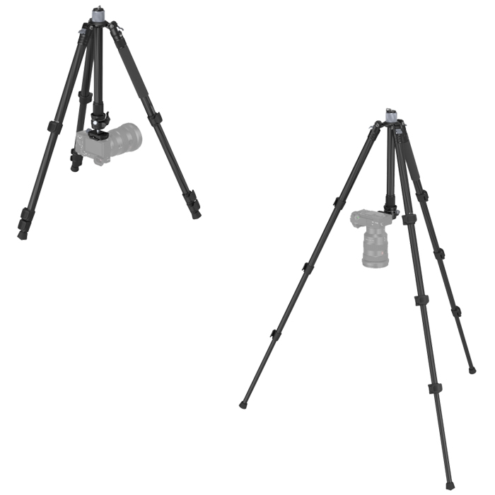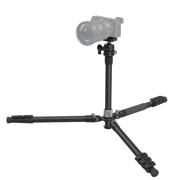 Den aftagelige midtersøjle kan vendes om for optagelser med lav vinkel, og et af benene kan bruges separat sammen med hovedet, så det fungerer som et etbenet stativ.