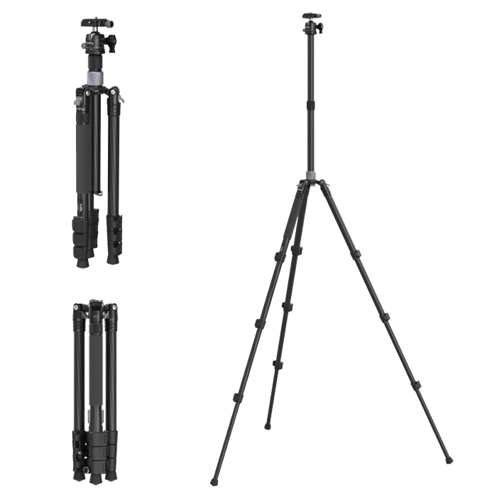 Stativet er specielt designet til rejsefotografi, har en sammenfoldet længde på kun 40 cm. Benene i fire sektioner med drejelåse gør det muligt at forlænge stativet til en højde af 158 cm.