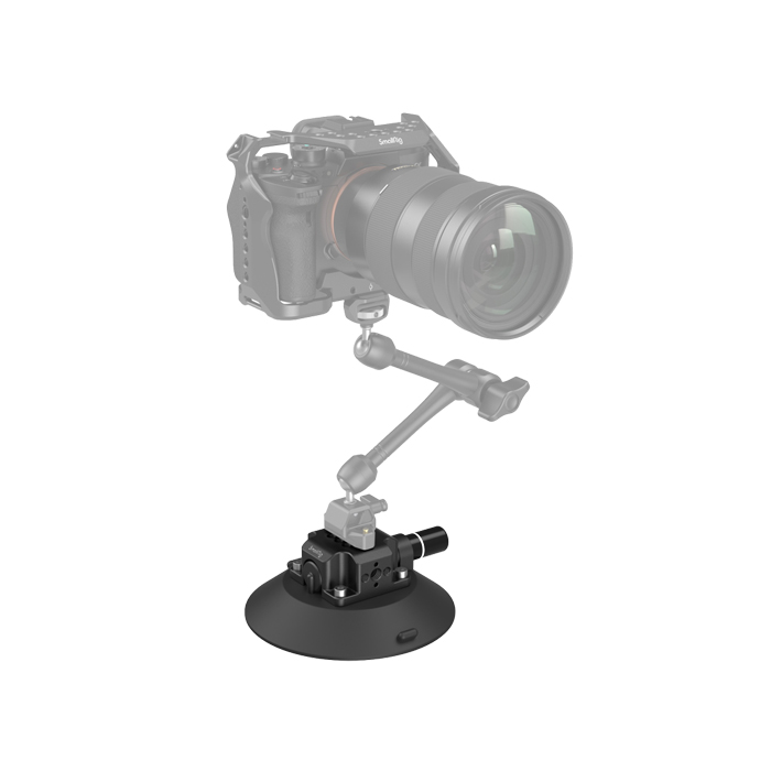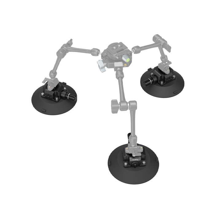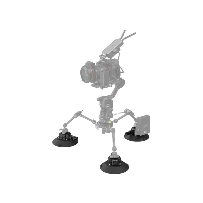 The aluminum-alloy suction cup mount comes with accessory mounting points: 1/4"-20 threaded holes, 3/8”-16 threaded holes, and ARRI 3/8"-16 locating holes.