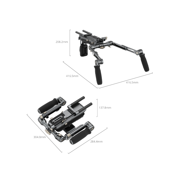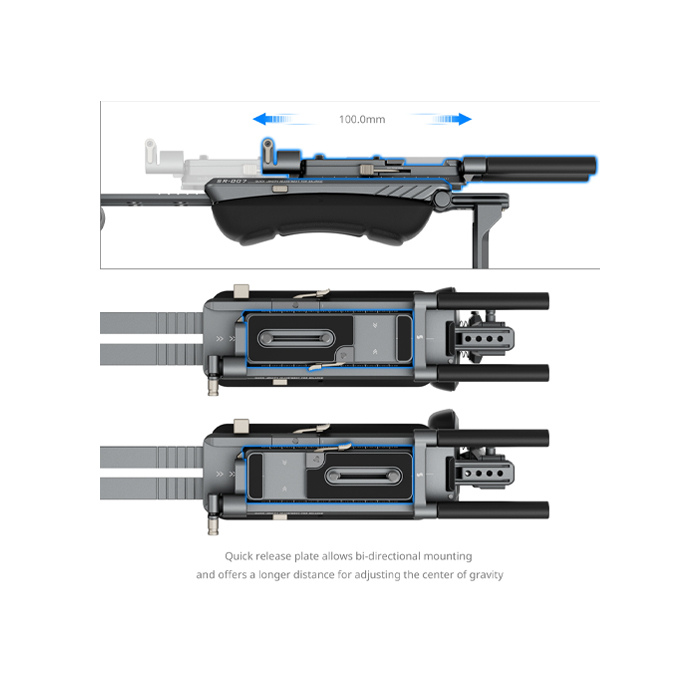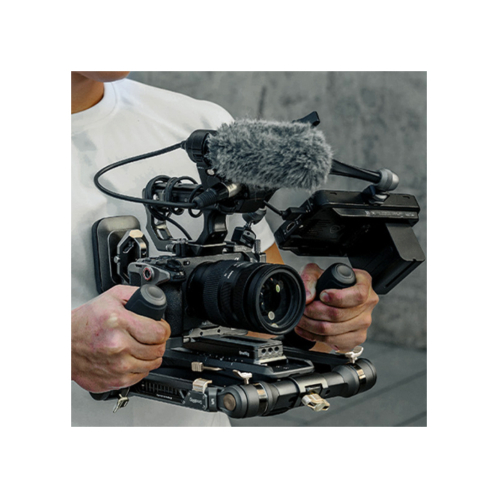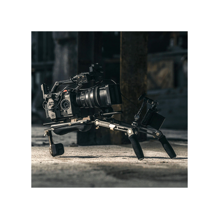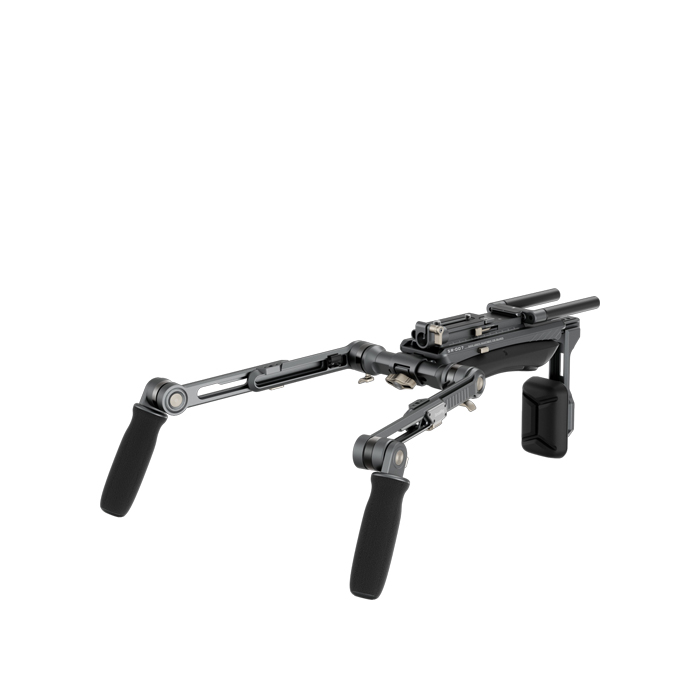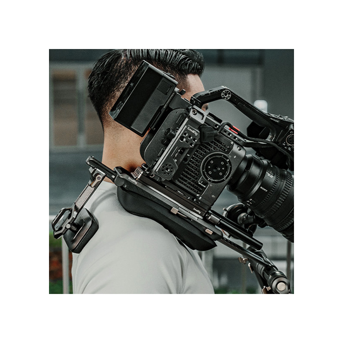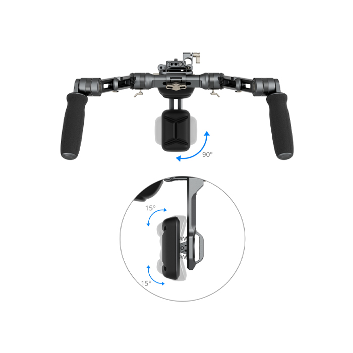 The shoulder rig kit features ergonomic handles with fine textures, providing a comfortable grip and facilitating 360° rotation. The connecting shaft of extension arms can be adjusted horizontally for optimized control, while the streamlined shoulder and back pads provide exceptional support. The back pad adjusts up to 90° for a snug fit at any shooting angle, and the quick-release plate enables easy front-to-back adjustments for swift balance.