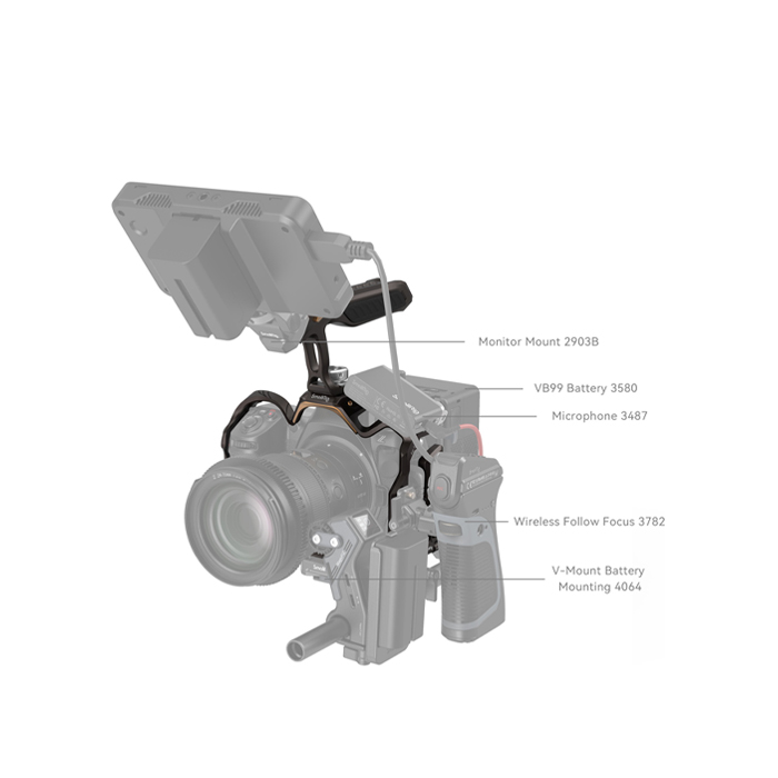 Among its accessory mounting interfaces, 1/4"-20 threaded hole, 3/8"-16 threaded hole, and ARRI 3/8"-16 locating hole support Side Handles 2093 & 3814, Top Handle 3765, Monitor Mounts 2903 & 2904, Manfrotto Quick Release Plates 1280 & 2458, Mounting Clamp for Portable Power Banks 2336 and mini V-Mount Battery Plate 2987. Side 1/4"-20 locating hole fits Single Rod Clamp 3598 and Magic Arm with Dual Ball Heads 3873, and the NATO rail on the left quickly connects NATO Side Handles 3847 & 4017. Besides, there are strap holes for Hand Straps 3848 & 2456; and a QD socket for the QD strap buckle.