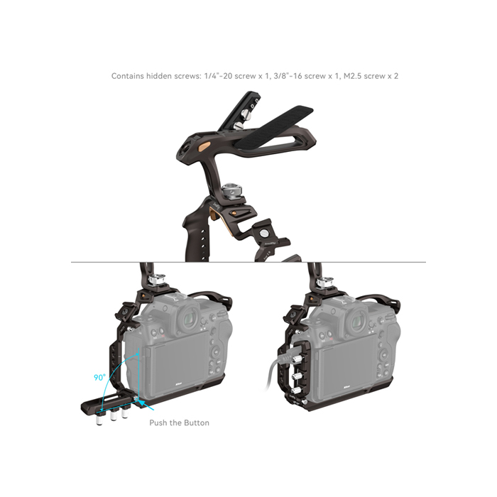 The Cage adopts a three-point locking system: secure your Nikon Z 8 via a bottom 1/4 "-20 screw and two M2.5 screws on both sides. The built-in pads prevent the camera from scratches. Unobstructed access to buttons, card slots, flip screen, and battery cover. The detachable Cold Shoe Mount for an LED video light or a microphone is fitted with a positioning pin to prevent deflection.