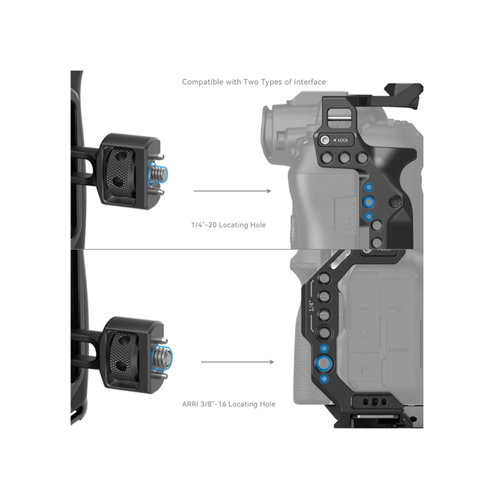 Comes with 1/4"-20 threaded hole, 1/4"-20 locating hole, strap hole, cold shoe for attaching Monitor Mount 2905, Ballhead Magic Arm 3875, LED Video Light 3286, Microphone 3468, etc. Besides, a built-in magnetic Allen Wrench is included for easy mounting and adjusting accessories.