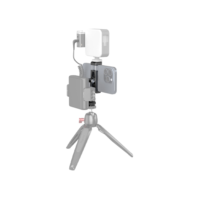 SmallRig 4382 Metal Phone Support with Cold Shoe can be mounted on the top of the camera with one 1/4"-20 screw and supports phones with a width of 57-88mm / 2.5-3.5in.