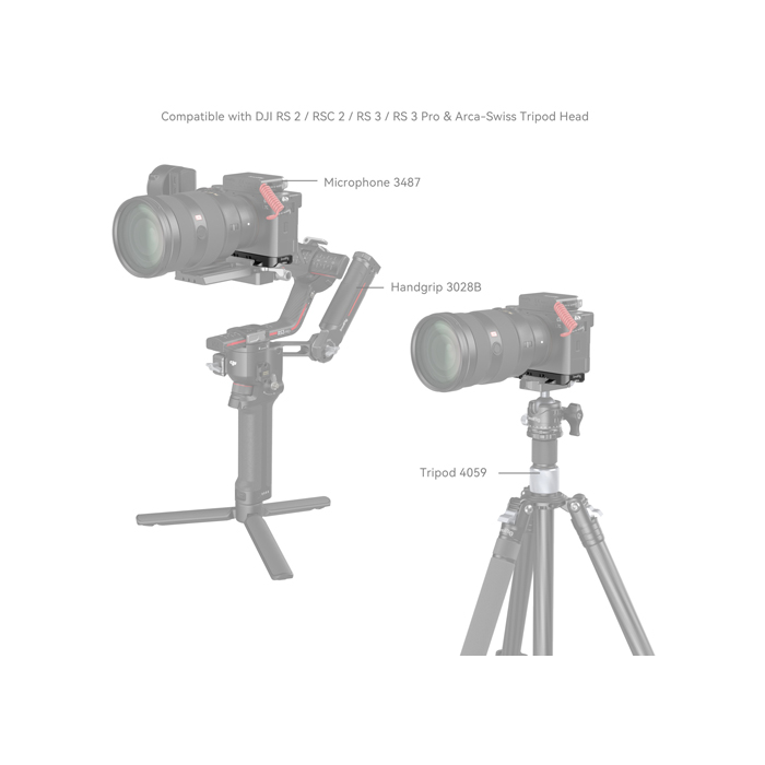 The Arca-Swiss quick release plate on the bottom supports DJI RS 2 / RSC 2 / RS 3 / RS 3 Pro gimbals as well as DJI RS 2 / RSC 2 gimbal’s quick-release plate and Arca-Type Quick Release Plate 3154.