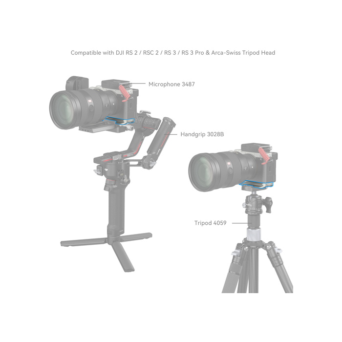 The Arca-Swiss quick release plate on the bottom supports DJI RS 2 / RSC 2 / RS 3 / RS 3 Pro gimbals as well as DJI RS 2 / RSC 2 gimbal’s quick-release plate and Arca-Type Quick Release Plate 3154.