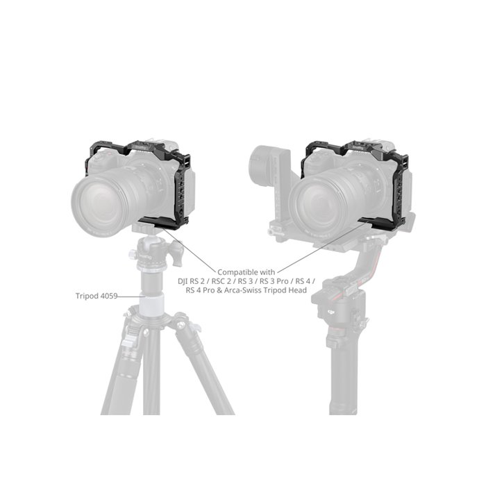 SmallRig Camera Cage for Nikon Z 6III 4519 is designed to provide protective housing and versatile expansion options for a camera. The cage securely fastens the camera with a 1/4"-20 screw at the bottom and dual M2.5 screws on the sides, while integrated pads prevent scratching. It provides unobstructed access to all camera interfaces, card slots, the flip screen, and the battery door.