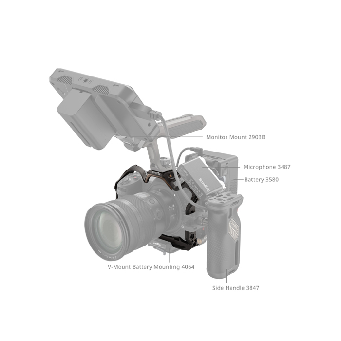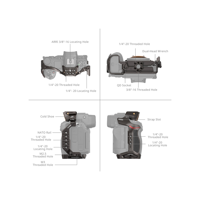 The cage features various expansion interfaces, such as 1/4"-20 threaded holes, 3/8"-16 threaded holes and ARRI locating holes, compatible with side handles (ID 2093, 4015), top handles (ID 3765), monitor mounts (ID 2903, 2904), tripods (ID 3989, 4465), power bank holders (ID 2336) and mini V-mount battery plates (ID 2987). Incorporated 1/4"-20 locating holes on the sides allow for the attachment of accessories such as the single rod clamp (ID 3598), magic arm (ID 3873), and side handle (ID 4346).