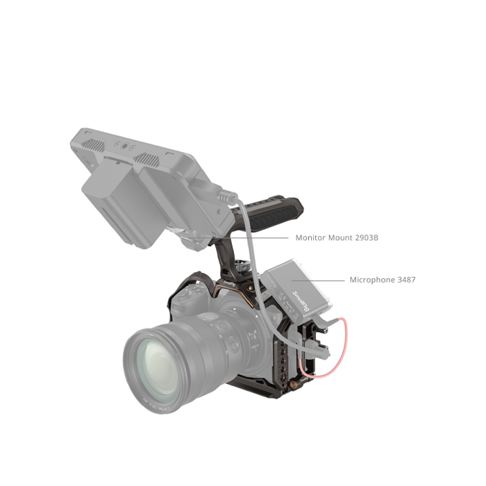 It can be attached to the sides and top of the cage, allowing for versatile expansion with microphones (ID 3487), LED video lights (ID 3286), and other accessories. The ergonomic handle facilitates camera movement and features built-in storage for commonly used screws such as 1/4"-20 screws, 3/8"-16 screws, and M2.5 screws.