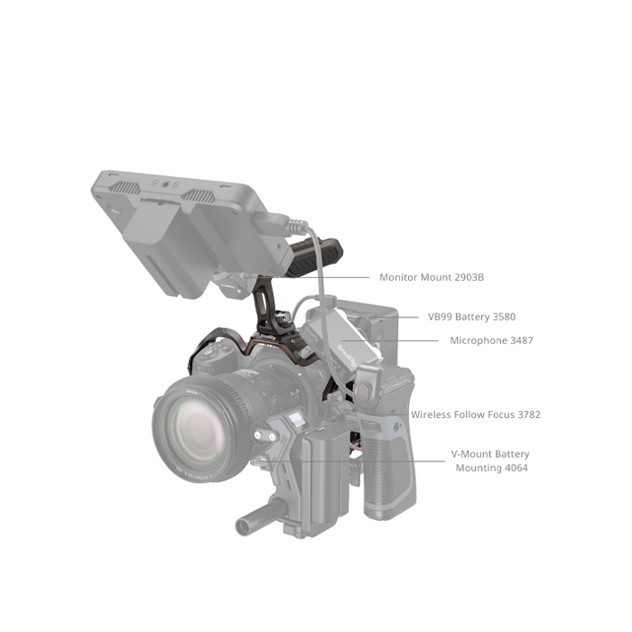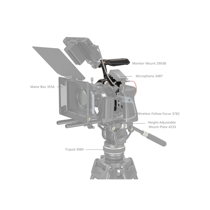 The cage can be expanded with monitor mounts (ID 2903B), side handles (ID 3847, 4016, 4015, 2093C), top handles (ID 2165C, 3765), rod clamps (ID 3598), magic arms (3875), tripods (ID 4465, 4060, 4353), LED video lights (ID 3286), microphones (ID 3487), and more.