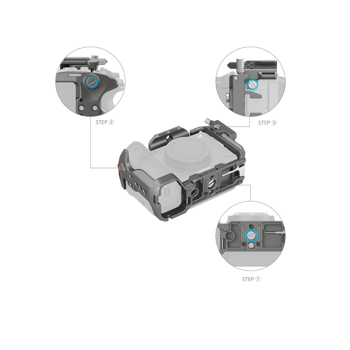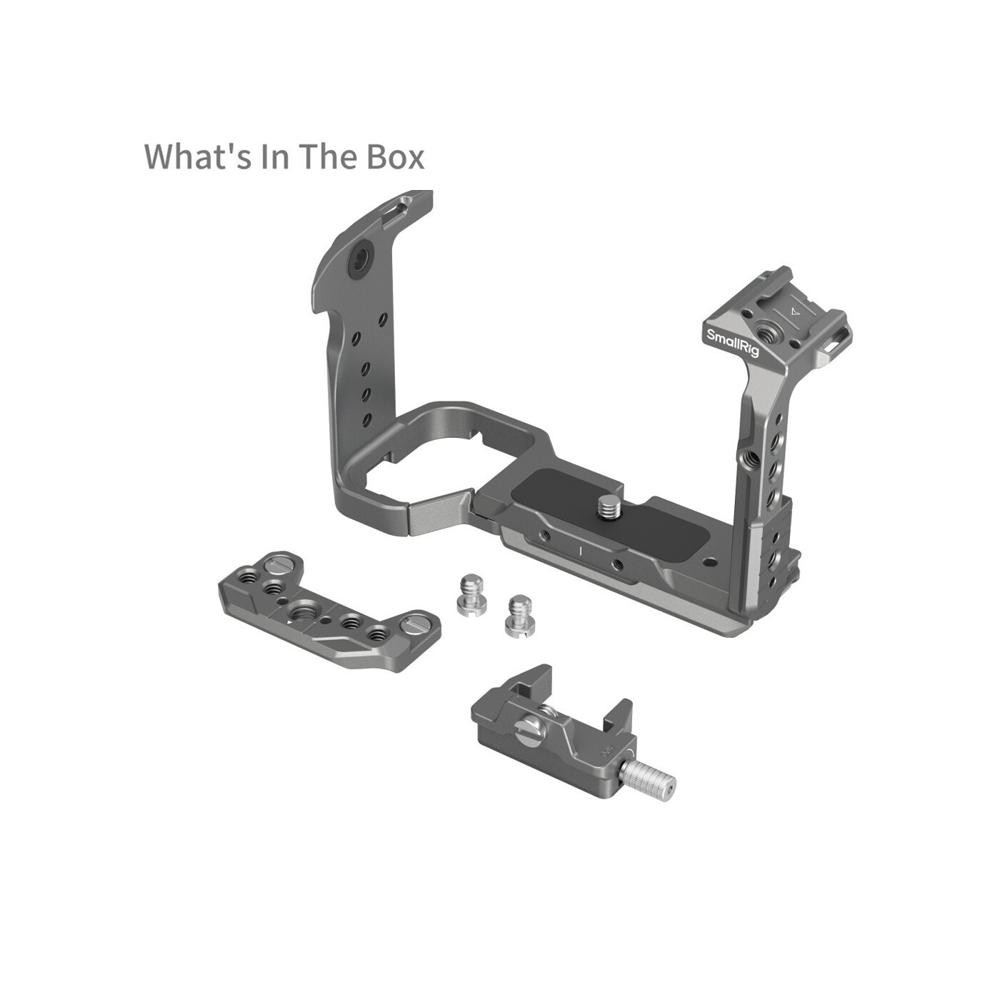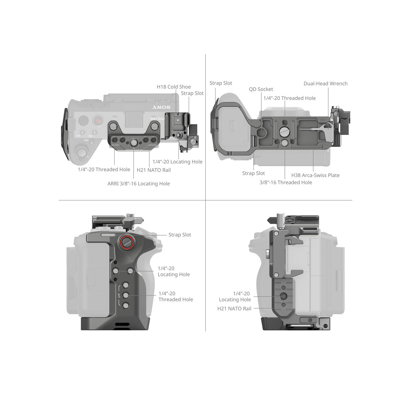 In addition, the cage has built-in 1/4“-20 threaded holes, ARRI 3/8”-16 Locating Hole, 1/4”-20 locating holes, QD socket, and strap slot, and can be expanded with accessories such as Magic Arm 3873, Top Handle 2165C, Rod Clamp 3598, QD Shoulder Strap, Hand Strap 3848, and Shoulder Strap PSC2428 for professional creation. A magnetic wrench is also included for easy assembly and disassembly.