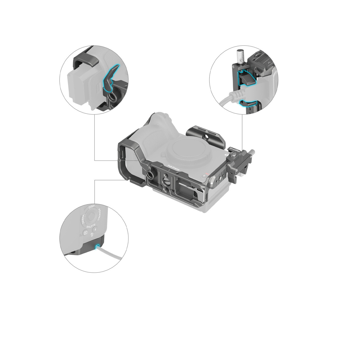 The NATO rail is secured on the top via two 1/4"-20 screws and removed to allow installing the original XLR top handle; the U-shaped cage is fixed via 1/4"-20 screws on both sides and at the bottom to prevent twisting, with a cushion against scratches. At the battery door, a hinge arm fits the camera curve for an improved grip experience for a little finger. A dedicated HDMI cable clamp protects interfaces to ensure stable signal transmission.