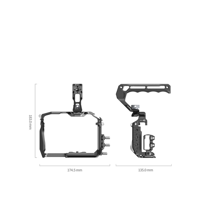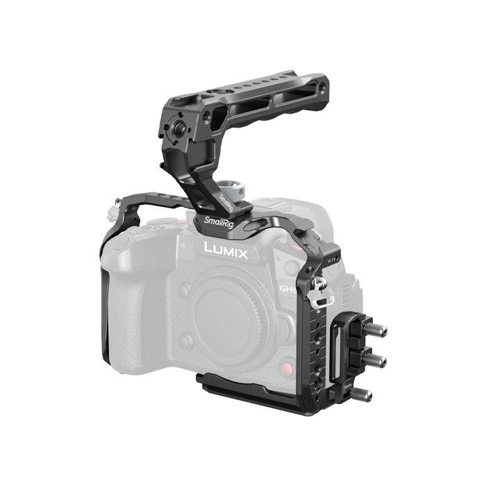 SmallRig 4825 HawkLock Quick Release Cage Kit for Panasonic LUMIX GH7 / GH6 is designed to facilitate low-angle shots and protect the camera while offering a wide range of accessory mounts. It includes a cage, an HDMI and USB-C cable clamp, and a top handle.