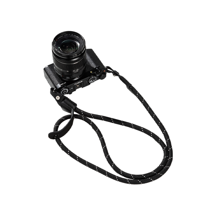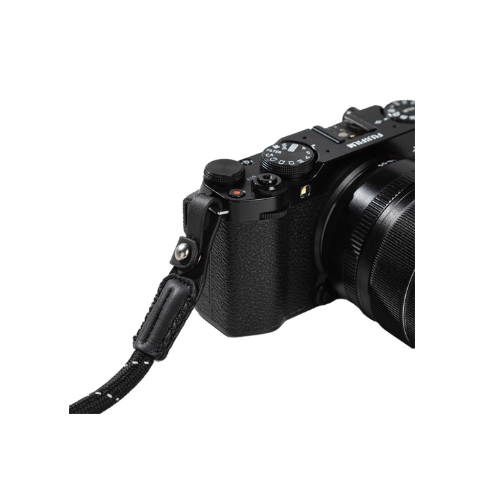 - The leather is threaded through the camera shoulder strap loop to use