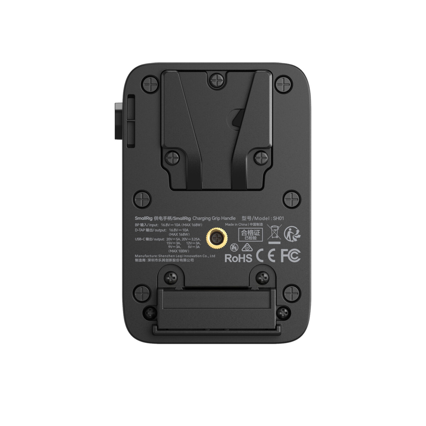 Basen er udstyret med en universel V-mount-fatning, der er kompatibel med standard V-mount-batterier, hvilket muliggør hurtig batteriudskiftning og sikrer en stabil strømforsyning under længere optagelser.