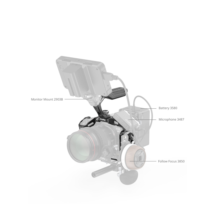 SmallRig 4976 "Black Mamba" Cage Kit for Canon EOS R5 Mark II is designed to enhance handheld shooting stability, portability, and accessory expansion. This kit includes a cage, USB-C & HDMI cable clamp, and a HawkLock top handle. Embodying the sleek "Black Mamba" style, the kit combines aesthetics with photographers' shooting needs. The comfortable grip of the top handle facilitates camera portability and low-angle shooting.