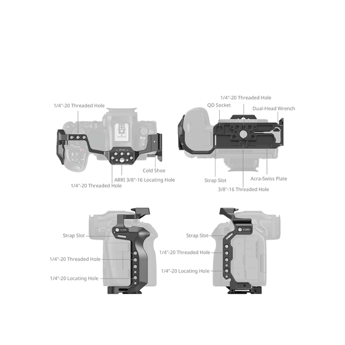 The cage features ordinary strap slots compatible with wrist straps (ID 3848, 2456), an innovative strap slot for downward hanging for extra lens protection, and a QD interface compatible with QD quick-release shoulder straps (ID 4118).