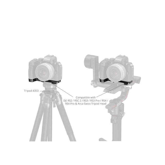 Equipped with a built-in 1/4"-20 threaded hole at the base, this plate offers versatility for expansion options, such as attaching the shooting grip (ID 4551). Furthermore, the integrated Arca-Swiss quick-release plate enables switching between Arca-type tripods and DJI RS2 / RSC 2 / RS3 / RS3 Pro / RS4 / RS4 Pro stabilizers, facilitating effortless transitions between handheld, stabilizer, and tripod shooting setups.