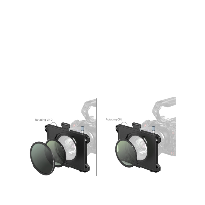 The VND filter frame features dual CPL+VND filter functionality with a magnetic attachment for various CPL and VND combinations. The VND features 2-5 stops with infinite adjustment. Incorporated hard stop and light transmission limit technologies effectively eliminate VND cross patterns.