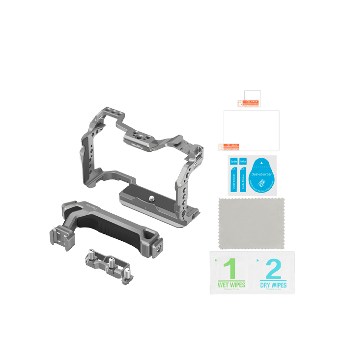 The kit has incorporated HawkLock quick-release interfaces for swift and secure mounting. It features the H21 quick-release NATO rail, H18 quick-release cold shoe mount, H38 Arca-Swiss quick-release plate, 1/4"-20 threaded holes, 1/4"-20 locating holes, 3/8"-16 threaded holes, ARRI 3/8"-16 locating holes, cold shoe mounts, NATO rails, QD interfaces, strap slots, and more for attaching monitors, microphones, tripods, follow focus systems, handles, and other accessories to enhance video content creation in various scenarios.