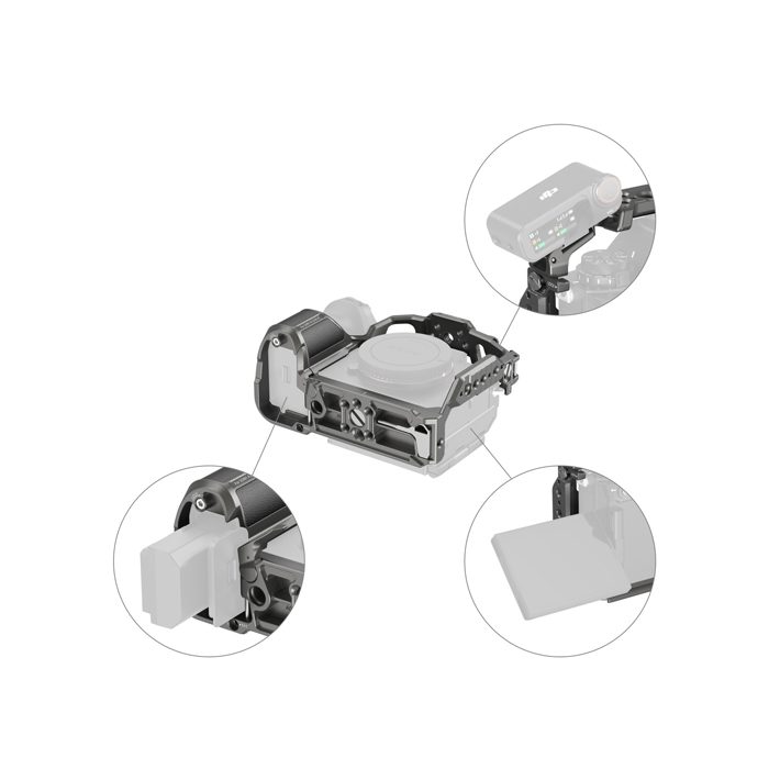 Derudover findes en cold shoe-mount til montering af tilbehør som DJI MIC II eller LED-videolys, samt et nederste 1/4"-20 gevindhul til stationære stativer eller DJI RS Mini-hurtigudløserplader, hvilket gør buret kompatibelt med forskellige stabilisatoropsætninger.