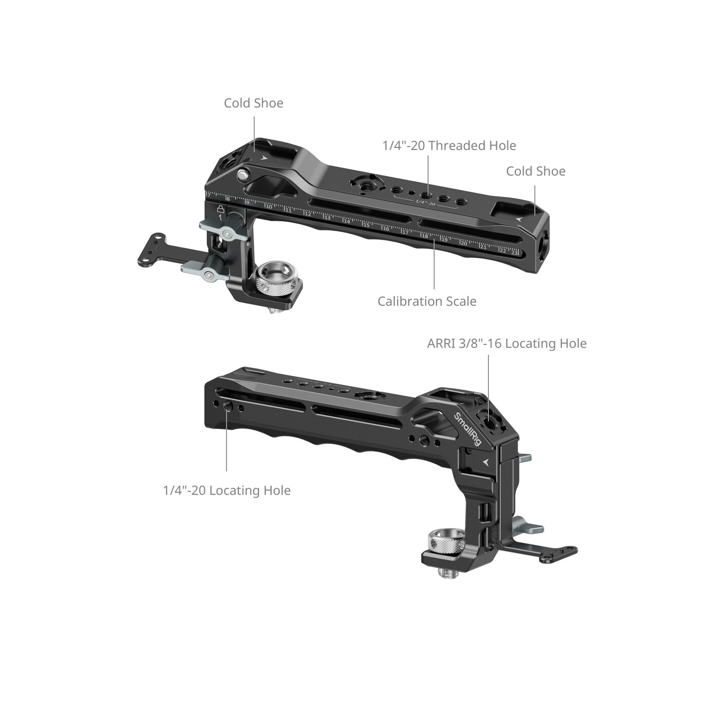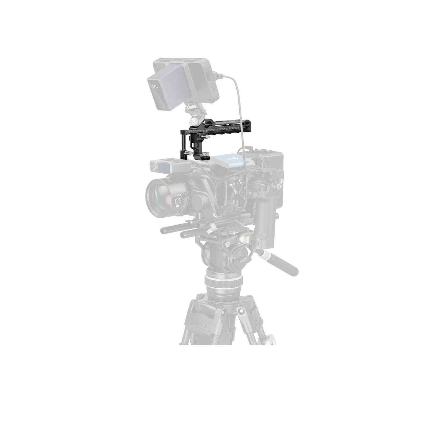 Topgrebet er ergonomisk udformet med komfortabelt greb og indlejret silikone, der sikrer skridsikker og kulderesistent brug. Det er udstyret med to cold shoe-fatninger foran og to bagpå til samtidig montering af tilbehør som mikrofoner, videolys eller skærme. Front- og topmonterede ARRI-positioneringshuller muliggør montering af monitor mount (ID 2903B), mens flere 1/4"-20 gevind og positioneringshuller på toppen og højre side er kompatible med magic arms (ID 4194, 4900) til monitor montering eller fjernbetjeninger (ID 3902) til styring af kameraoptagelser.