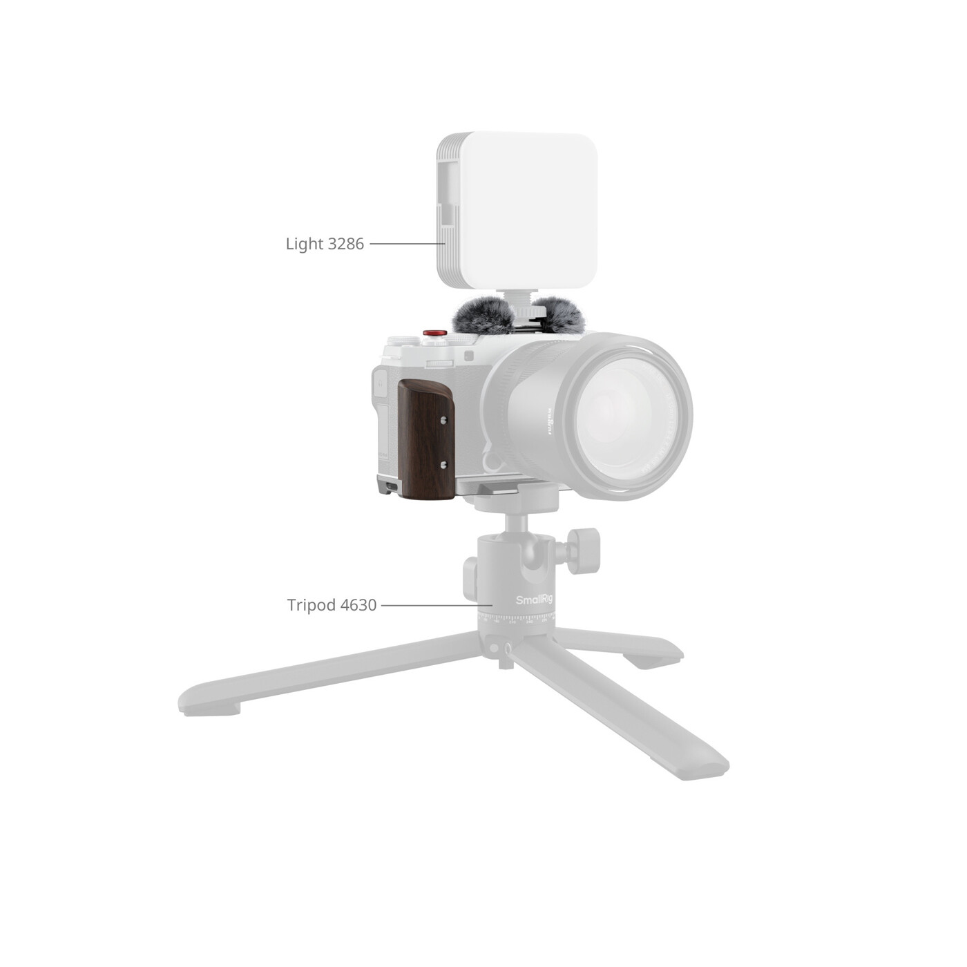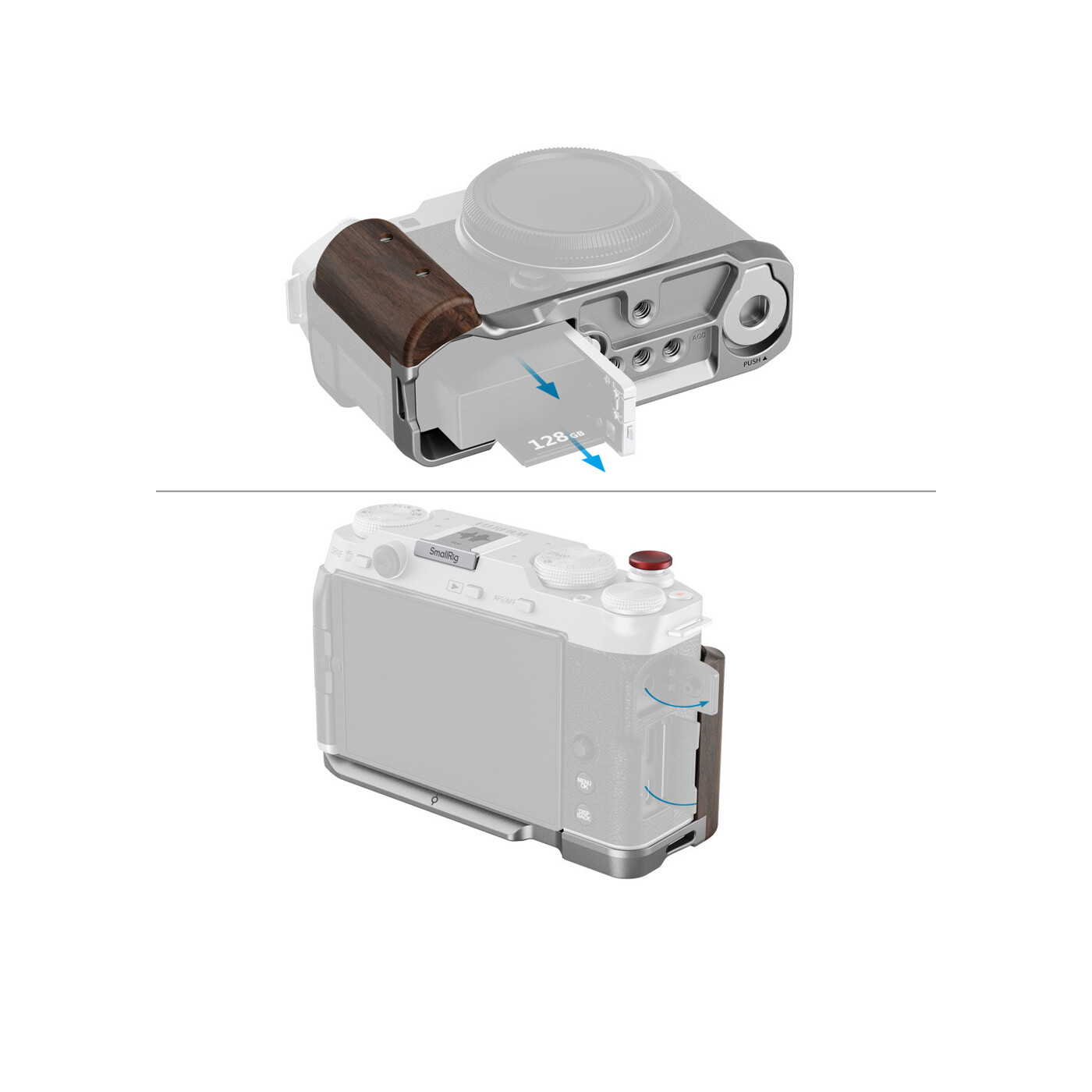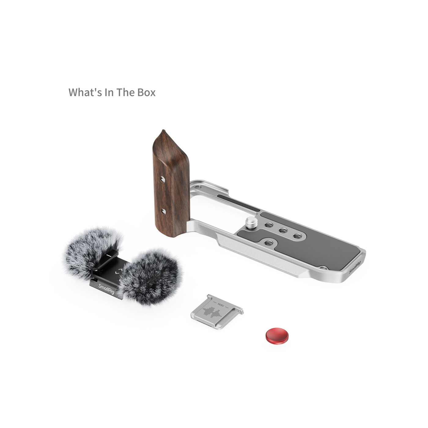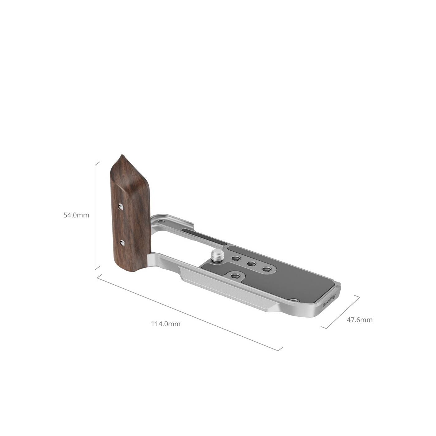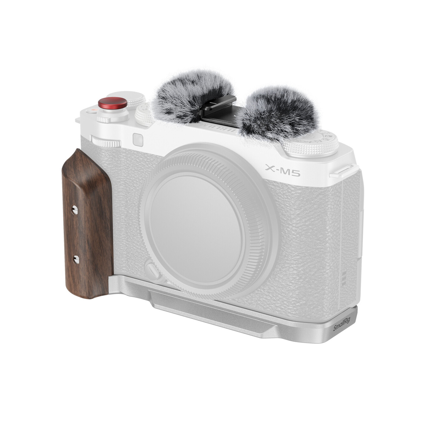 SmallRig 5261 L-formet monteringsplade med trægreb til FUJIFILM X-M5 (Sølv) er designet til at forbedre grebet på kameraet. Grebet monteres med en 1/4"-20 skrue i bunden, og de indbyggede silikonepuder beskytter mod ridser.