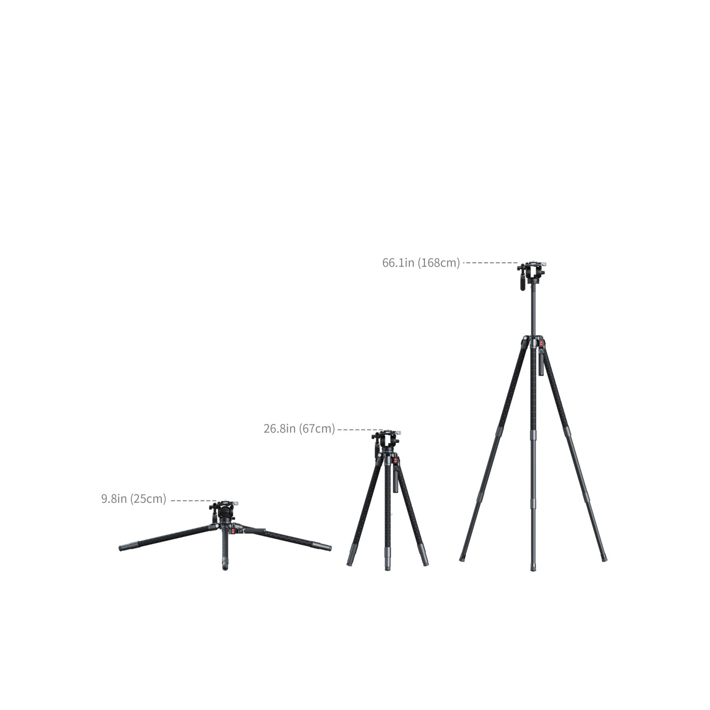 Stativet er udstyret med X-Clutch-hydraulikteknologi, som gør det muligt at folde alle ben ud, justere vinklen og låse dem automatisk med et enkelt tryk – alt sammen på ét sekund. Clutchen kan desuden indstilles til både 0° og 90° for at tilpasse sig forskellige optagelsessituationer. Ben og midtersøjle er fremstillet i aluminiumlegering, hvilket giver en let konstruktion med høj stabilitet og stor bæreevne. Arbejdshøjden spænder fra 25 cm til 168 cm, og den kompakte længde på 72 cm gør stativet let at transportere i almindelig bagage.