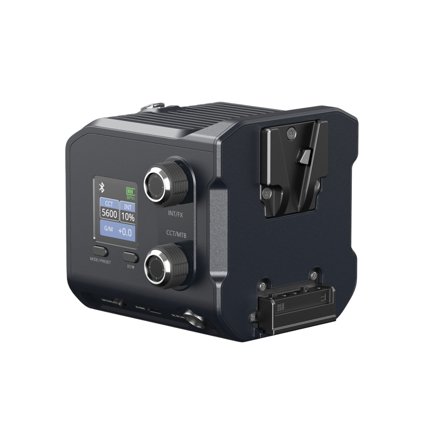 Strøm kan leveres trådløst med enten V-mount eller NP-F970 batterier – eller via USB-C med powerbank, batterigreb, opladerkabel eller en AC til DC-adapter.