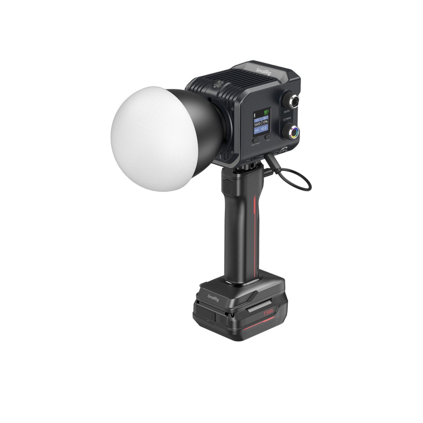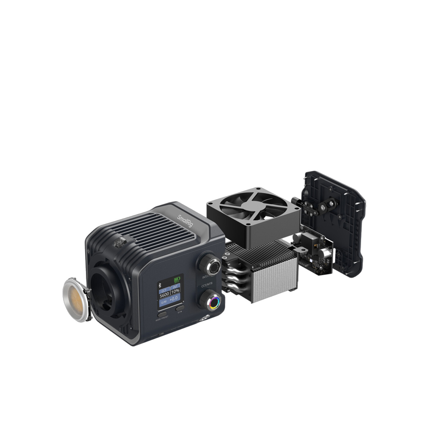 Fjernstyring via SmallGoGo-appen eller DMX-styring (kræver separat adapter). Manuelle justeringer foretages let via en 1,44” farveskærm og to separate drejeknapper.