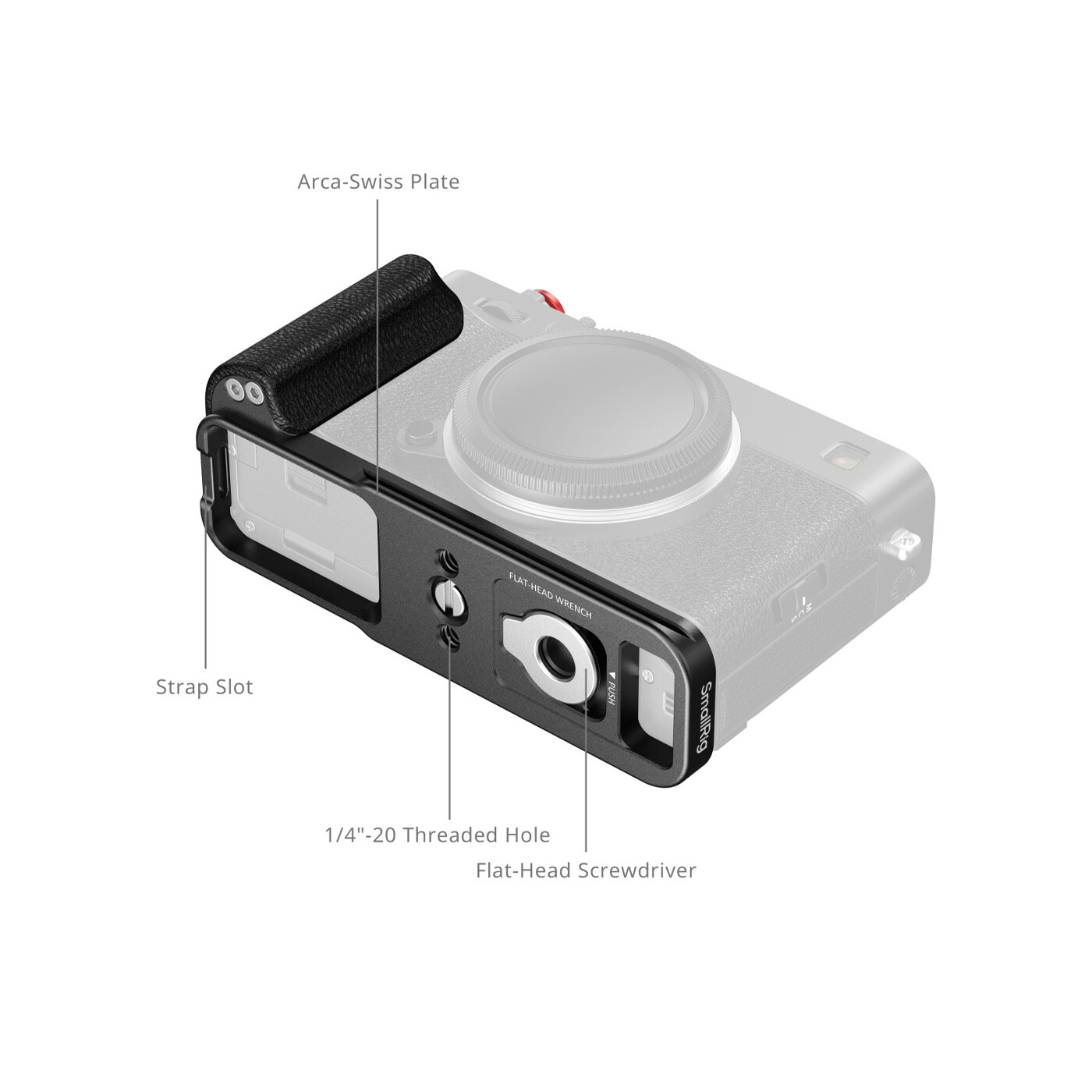 Det L-formede greb giver fuld adgang til alle kameraets funktioner – herunder batterirum, fokusring, hukommelseskortslot og højttalerporte. En medfølgende udløserknap forbedrer den taktile oplevelse og løfter optagekomforten.