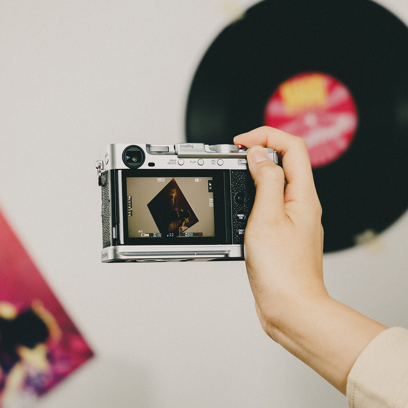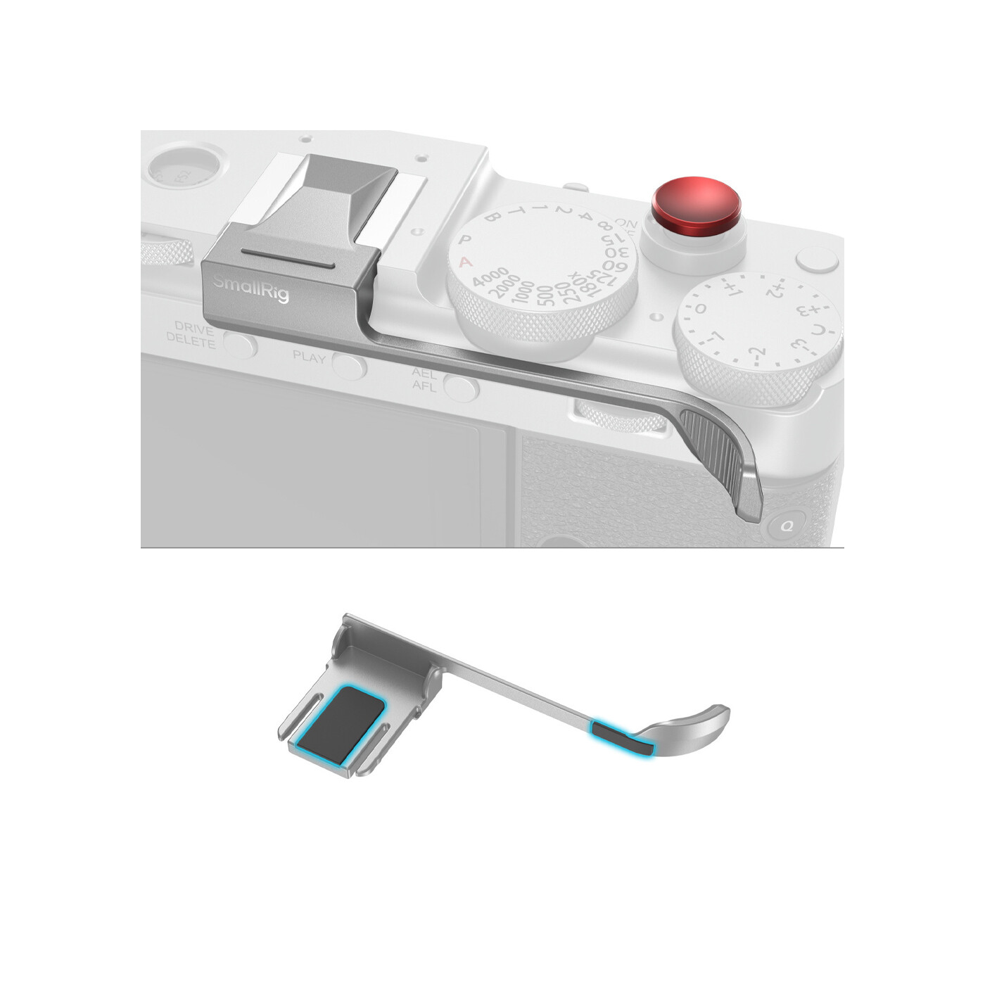 Det geometriske topdesign afspejler et minimalistisk æstetisk udtryk. Derudover beskytter indbyggede silikonepuder både kameraets overflade og tilbehørsskoens kontakter, mens en smart placeret fingerfordybning gør det nemt at montere og afmontere grebet. En medfølgende udløserknap giver forbedret taktil respons og en mere intuitiv optageoplevelse.