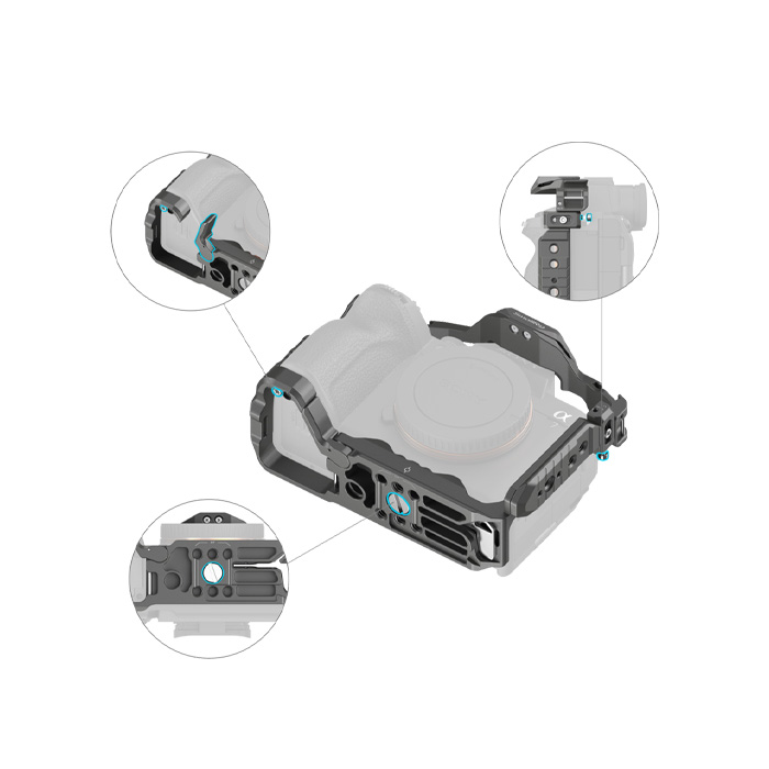 It locks the camera via one bottom locating pin, one 1/4"-20 screw, and one M2.5 screw on the left side. The side lock adapters need to be adjusted in the installation direction to fit different camera types, printed with “A7 IV” is for Alpha 7 IV and Alpha 7R V while printed with “A7S III” is for Alpha 7S III / Alpha 1 / Alpha 7R IV. Built-in all-around protective spacers prevent the camera from being scratched.