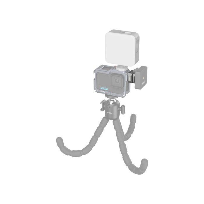 The base plate is equipped with spring-loaded locating pins to support SmallRig action camera cages like 4119B, 3084C, 4088B, and various others with locating holes to ensure safety and stability.