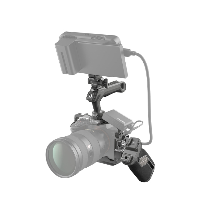 The monitor mount supports 180° tilt and 360° horizontal adjustment, comfortable to watch at any angle. The top handheld is ergonomically designed for comfortable grip, convenient for kit handling and low-angle shooting. The swivel side handle supports step-less rotation by pressing down, and the angle change still maintains a comfortable grip. The HDMI cable clamp protects the interface for more stable signal transmission.