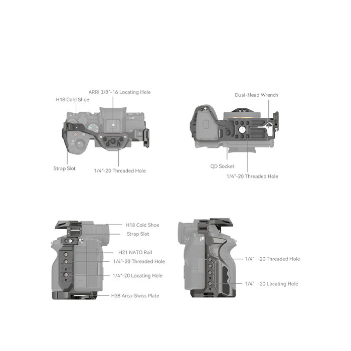 The cage adopts a three-point locking design, stable and not shaking. The bottom of the cage and the bottom of the side handle have built-in disassembly tools, which are easy to take out and use as you go, so it is easy to disassemble quickly. The kit has built-in 1/4"-20 threaded holes, ARRI 3/8" -16 locating holes, cold shoes, NATO rails, QD sockets, and strap holes, making it easy to expand a variety of accessories for creative endeavors.