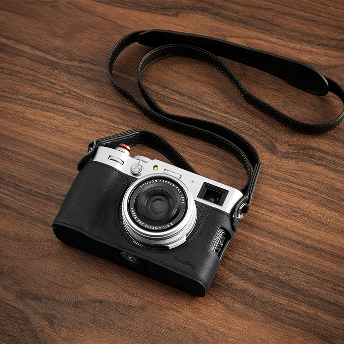SmallRig 4699 Leather Half Case Kit for Fujifilm X100VI is designed to protect the camera while enhancing its vintage charm and quality. The kit includes a leather half case and a shoulder strap. The durable and breathable top-grain leather material of the half case enriches the camera's retro aesthetics and feel, while its suede lining ensures protection against scratches.