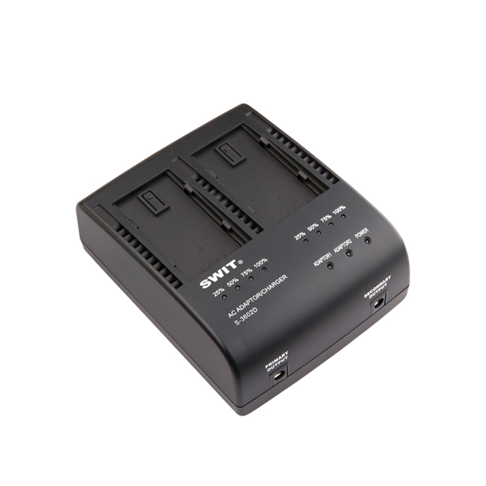 S-3602D is a dual channel charger for SWIT S-8D98, S-8D58 and S-8D62, and compatible with Panasonic VW-VBD58, AG-VBR59 and CGA series D54, D28 DV batteries.