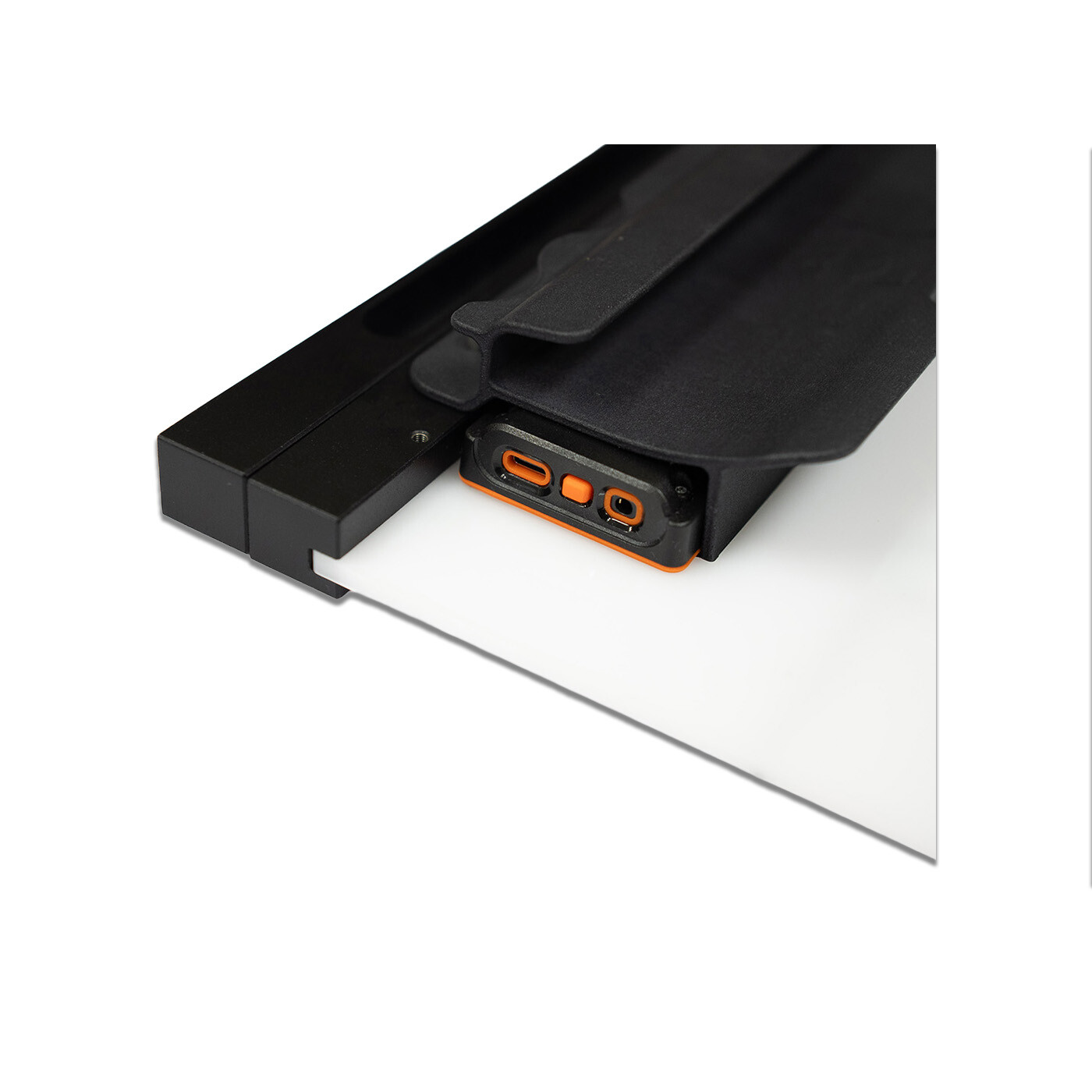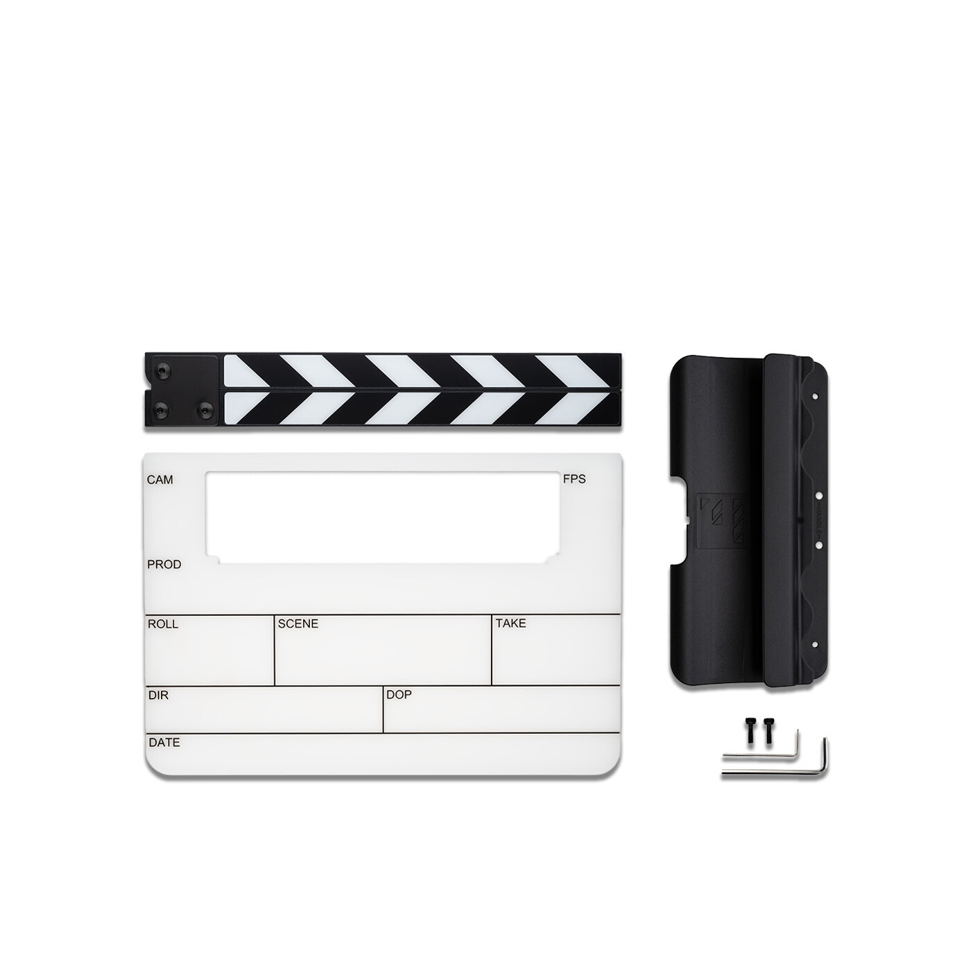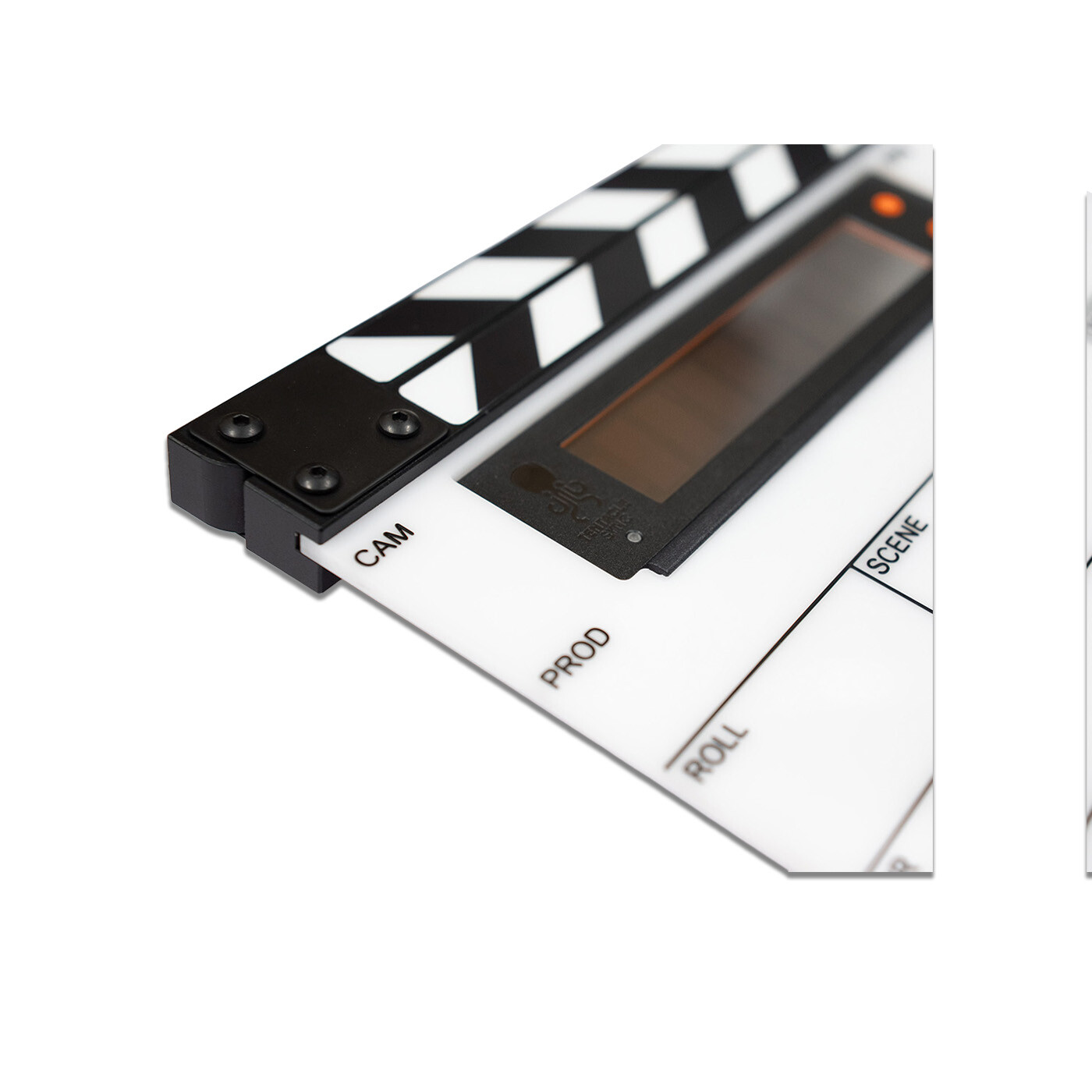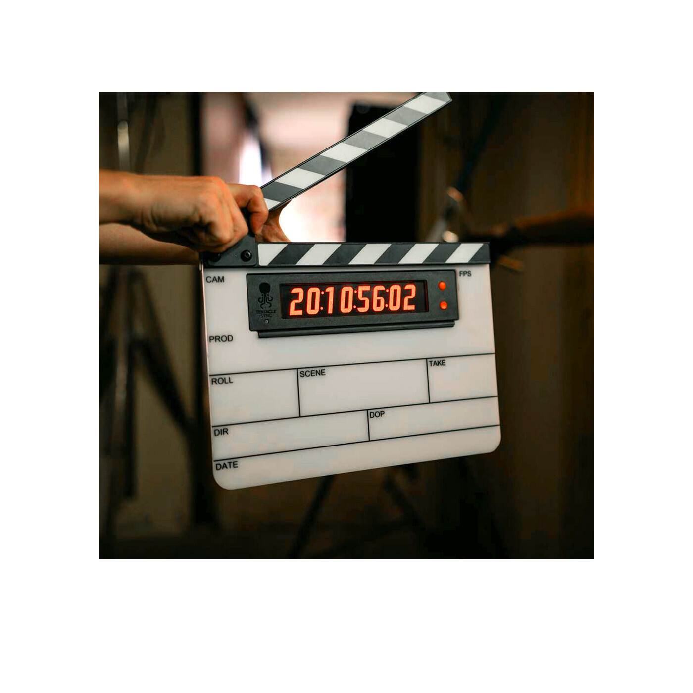 TIMEBAR Timecode Slate leveres komplet med Tentacle Sync TIMEBAR og tilbyder en kraftfuld og alsidig løsning til synkronisering på settet. Clapperboardet inkluderer et præcisionsfremstillet board med Roll/Scene/Take layout, holdbare clapper sticks og en specialdesignet holder.