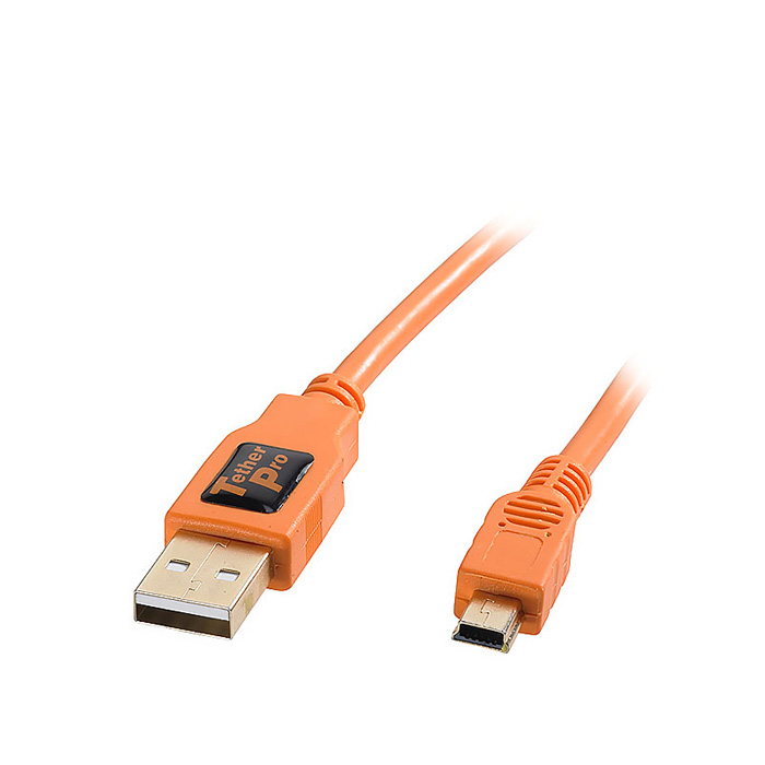 The TetherPro cable connects to a camera using a Mini-B 5 Pin port. This cable is designed and manufactured to highest USB specifications ensuring delivery of excellent performance in speed and reliability. Available in High-Visibility Orange or Black.