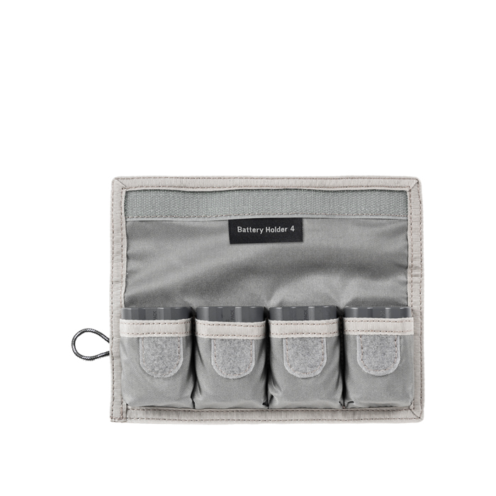 Kompakt holder til fire standard DSLR- eller mirrorless batterier. Den holder dine batterier samlet, så du ikke skal kigge alle lommer igennem i din taske. Passer nemt i lommen eller kan fastgøres til bæltet eller tasken.