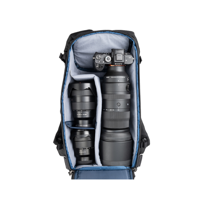 - Adjustable dividers accommodate large telephoto lenses, traditional photo gear, or personal items