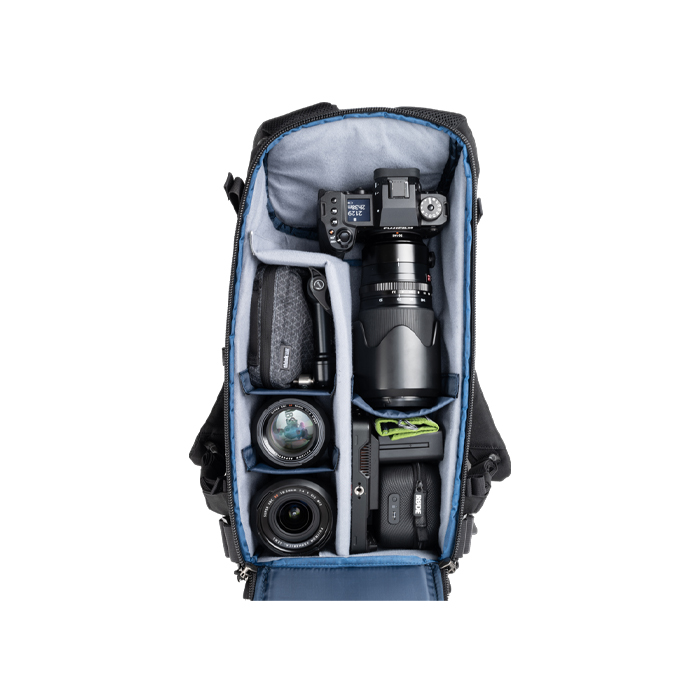 - Adjustable dividers accommodate large telephoto lenses, traditional photo gear, or personal items