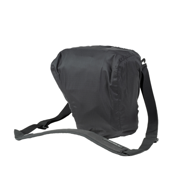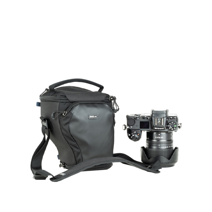 Unique holster developed specifically for a larger compact body with a 24-70mm f/4 attached with the hood reversed. Popped-down, it fits a 24-70mm f/2.8 with its lens hood reversed.