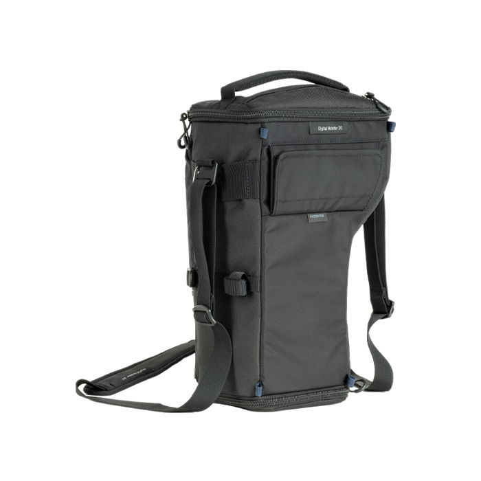 Unique holster developed specifically for a standard-size camera body with a 70-200mm f/2.8 attached with its hood reversed. Popped-down, it fits a 70-200mm f/2.8 with the hood in shooting position.