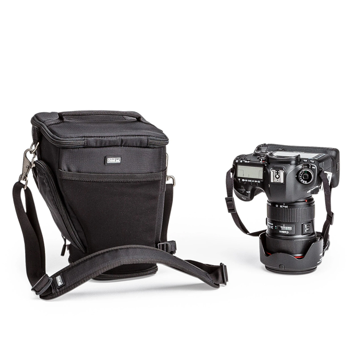 - Unique holster developed for gripped DSLR with a 24-70mm f/2.8 lens hood in shooting position