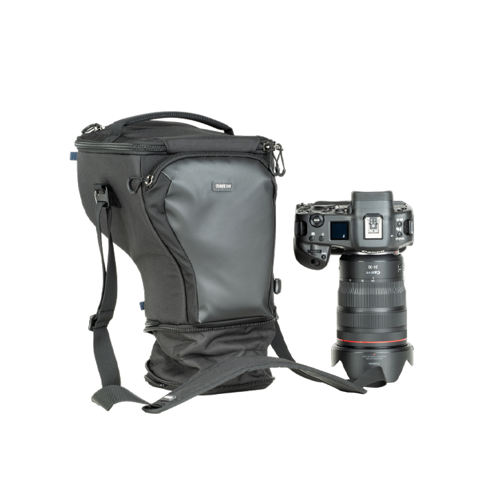Unique holster developed specifically for a gripped camera body with a 24-70mm f/2.8 with the hood reversed. Popped-down, it fits a 70-200mm f/2.8 with its hood reversed.