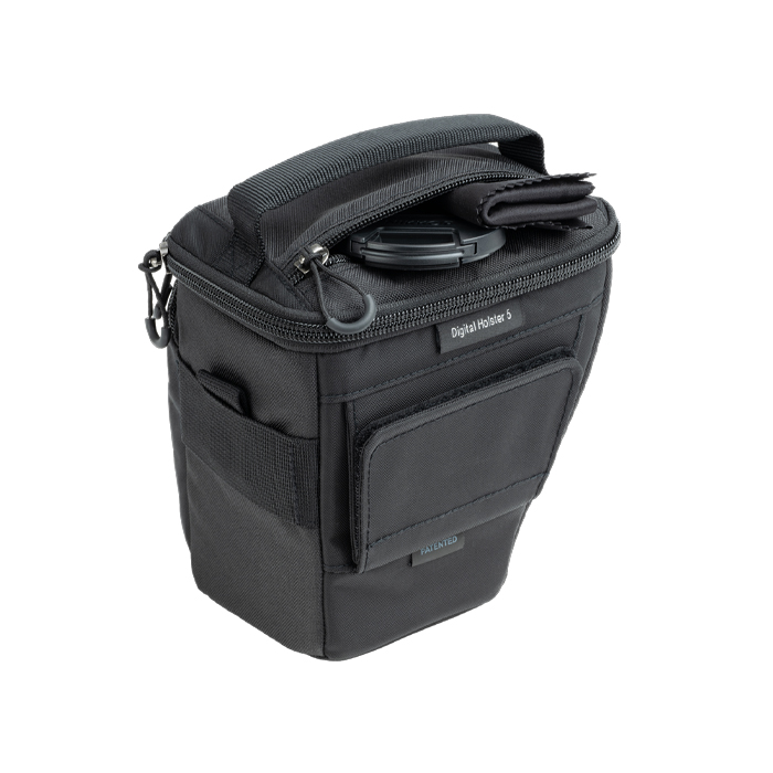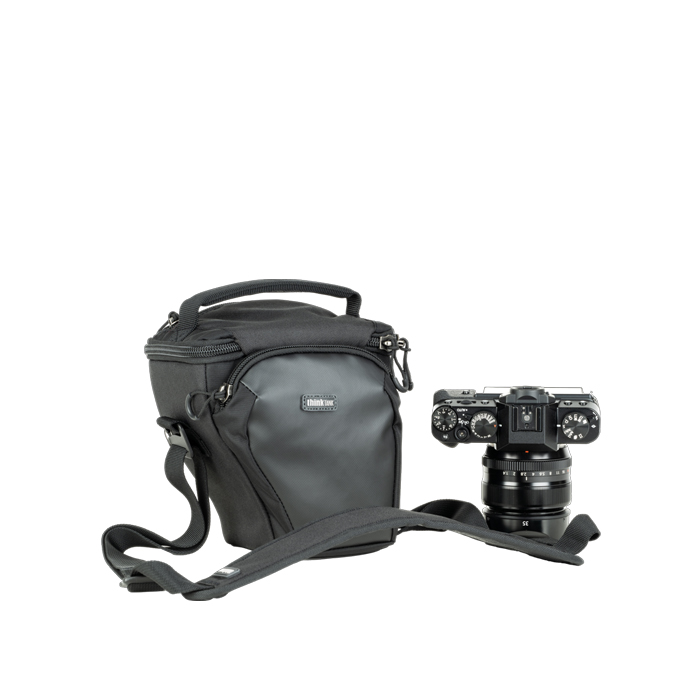 Unique holster developed specifically for a compact mirrorless body, such as a Canon R50 or R10, Nikon Z5, Fuji X-T30, or Sony A6000 series body with a short lens attached. Think Tank Digital Holster 5 V3 are designed to be form-fitting to a standard or gripped camera body with a zoom lens attached and have a large zippered front pocket for extra accessories.