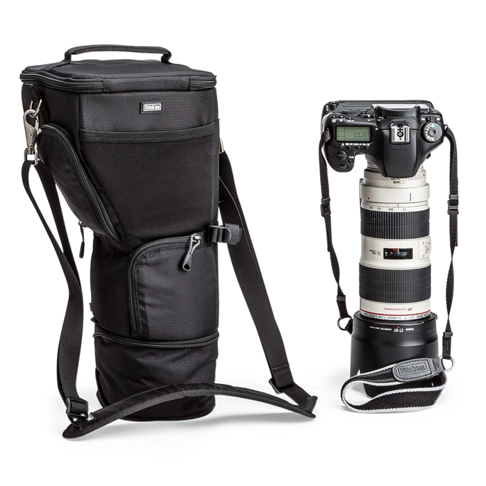 - Unique holster developed for gripped DSLR, 70-200mm f/2.8 with lens hood in shooting position