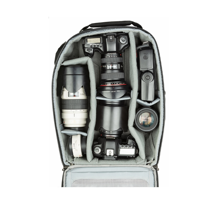 - Holds two standard-size DSLR bodies and 4–6 pro lenses